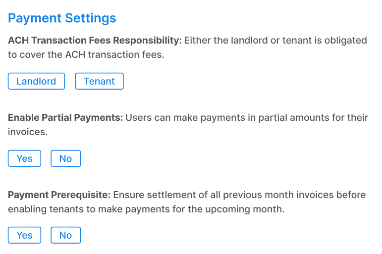 - Landlords can now specify whether they or the tenants are responsible for covering ACH transaction fees. This flexibility allows for a more tailored approach to payment processing.